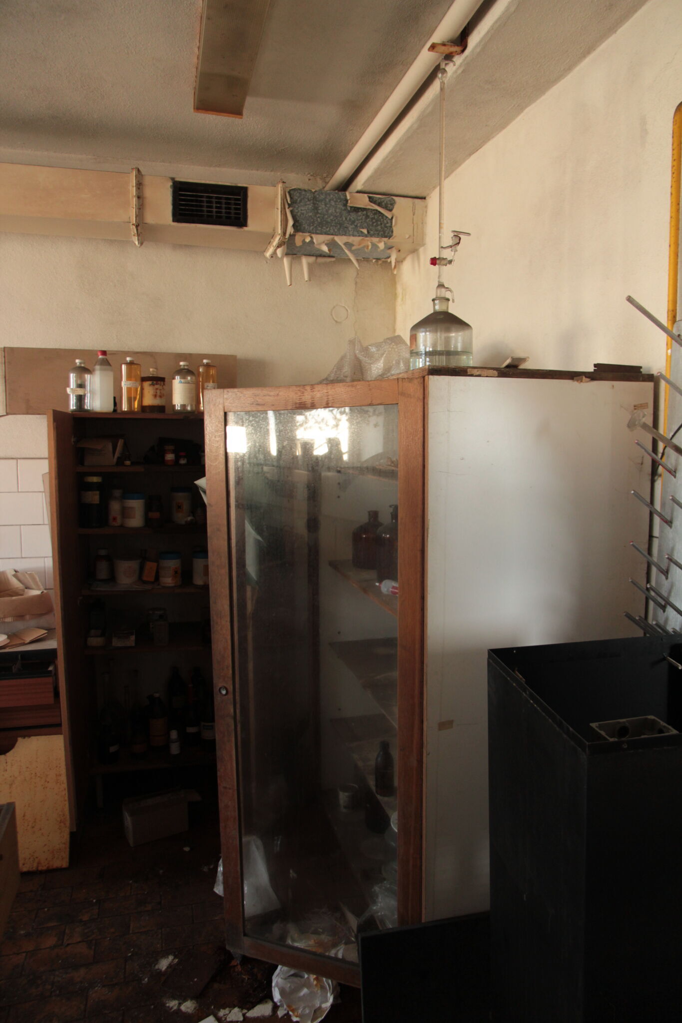 Hlavní výrobní prostory už zejí prázdnotou, ale v provozech jako byly truhlárny, dopravní oddíl, nebo vodní hospodářství se ještě pár věcí najít dá. To samé v laboratořích, kde místní rozkradli a rozprodali sklo. Kanceláře a jejich vybavení čím dál víc podléhají vlhku a v šatnách dodnes čekají bagančata a sušáky vlasů.