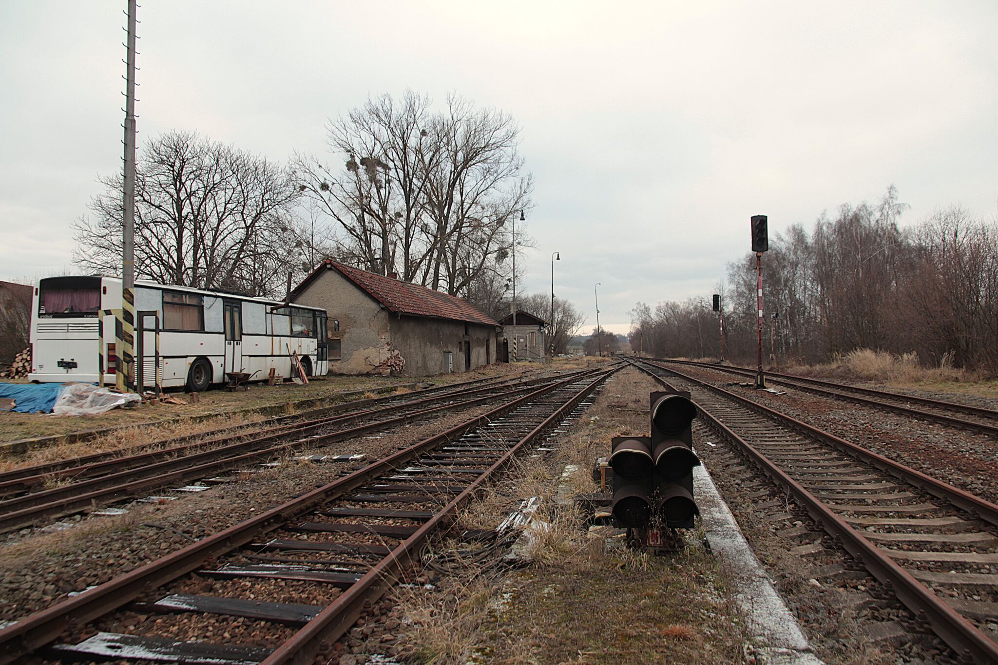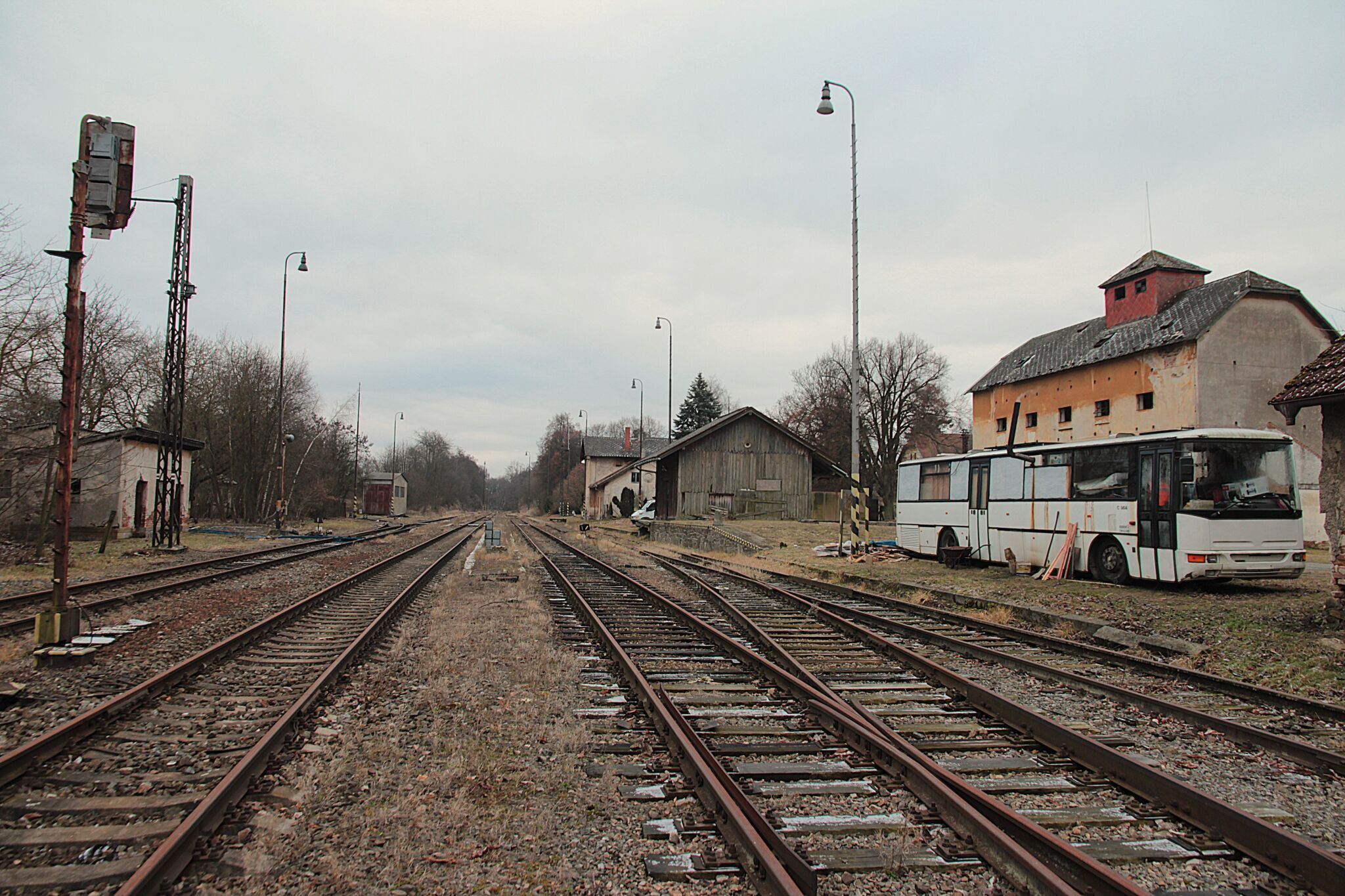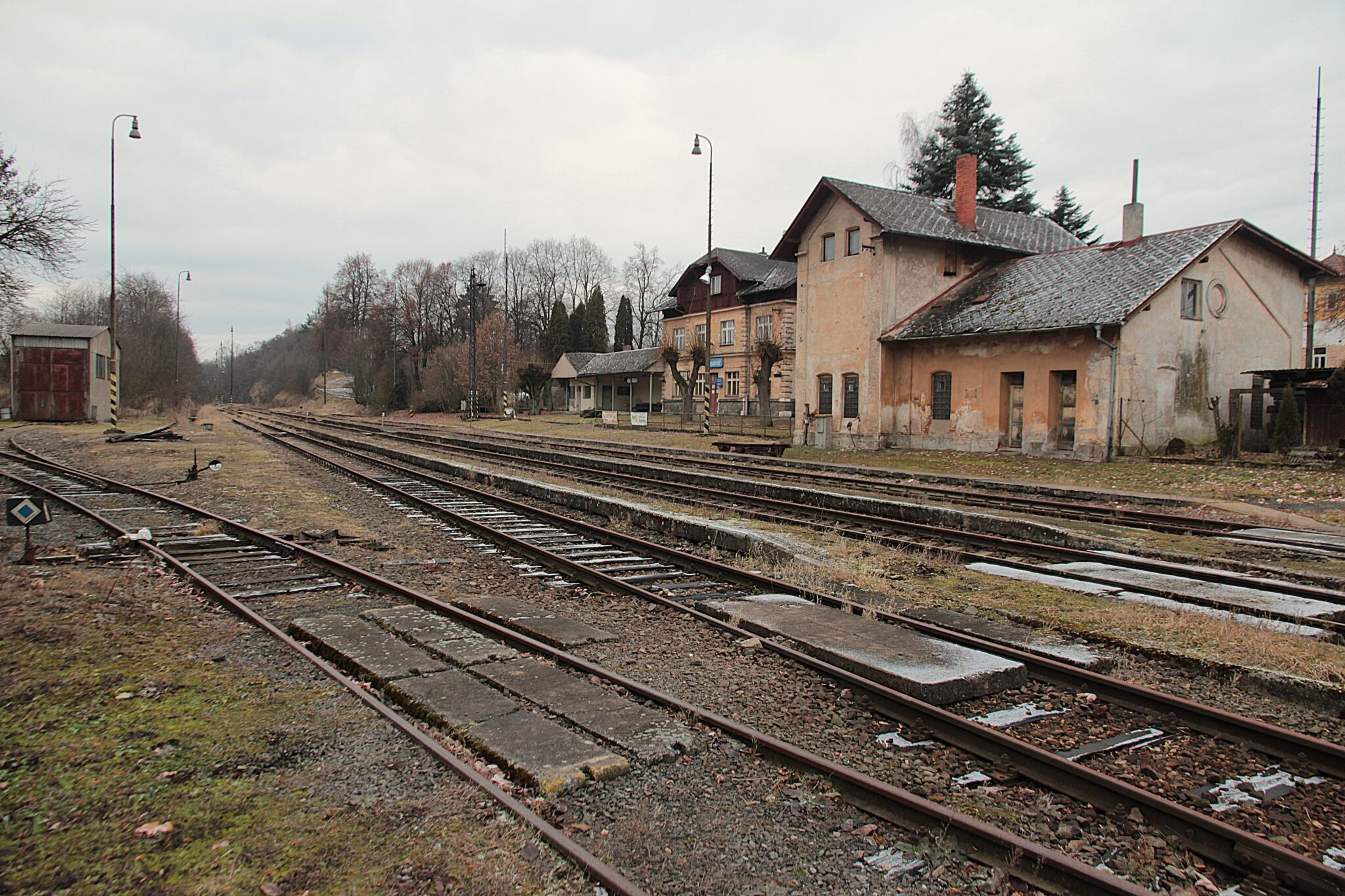 Bývalo to nádraží na hlavním tahu, žádné zapomenuté lokálce. Přesto tu staccato kol utichlo, stejně jako hlášení rozhlasu a ruch cestujících. Dodnes tu je vodárna připomínající parní éru, kdy dávala pít železným ořům a skladiště s rampou, pamatující kdy dráha vozila ještě běžně kusové zásilky. Přesto dnes jeho koleje končí za zhlavími, dráteníci smotali trakční vedení, návěstidla zhasla a expresy uhání úplně jinudy. Zůstalo opuštěné nástupiště, kde už nkdo nečeká, hodiny na kterých se zastavil čas, jeden opuštěný hitlák, který už nemá kudy by odjel a z autobusového přípoje je ubytování pro bezdomovce. I ta cedulka s nadmořskou výškou už zmizela....
