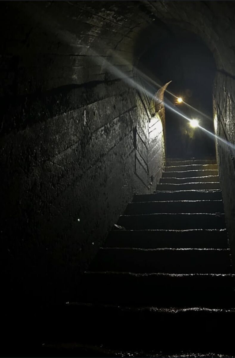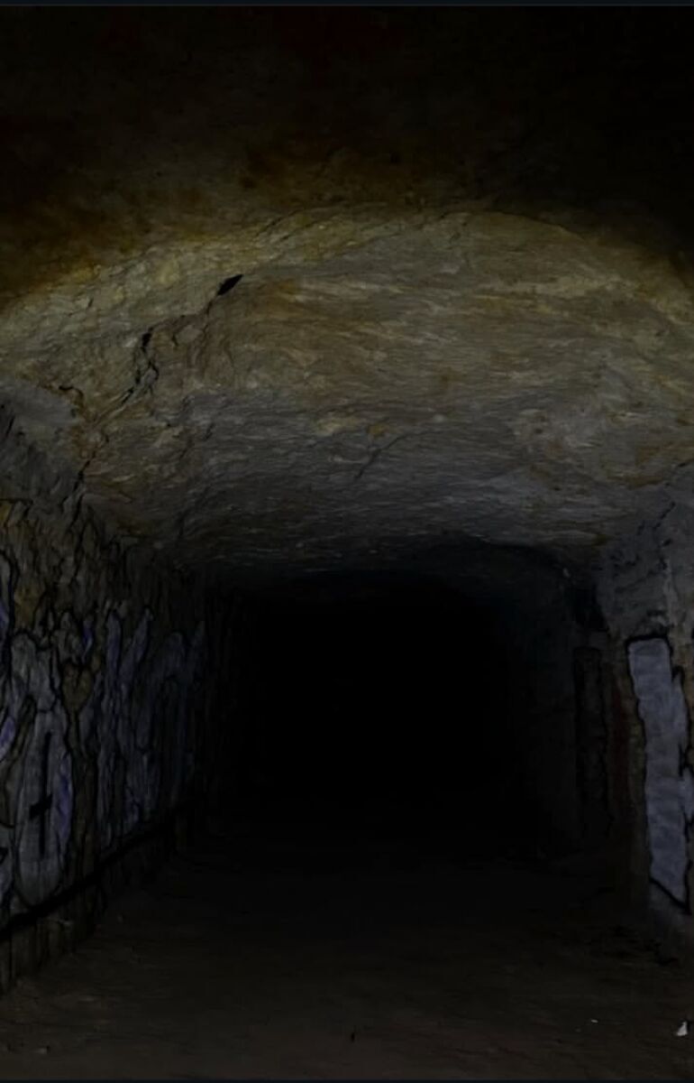 Wir besuchten einen ursprünglich kleinen Sandsteinstollen, der während des Krieges als Schutz vor Luftangriffen diente und sich in der Nähe des Flughafens befand.