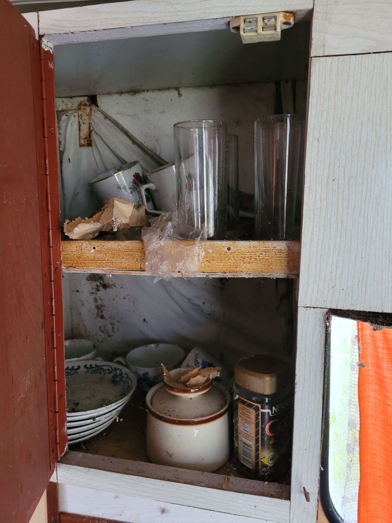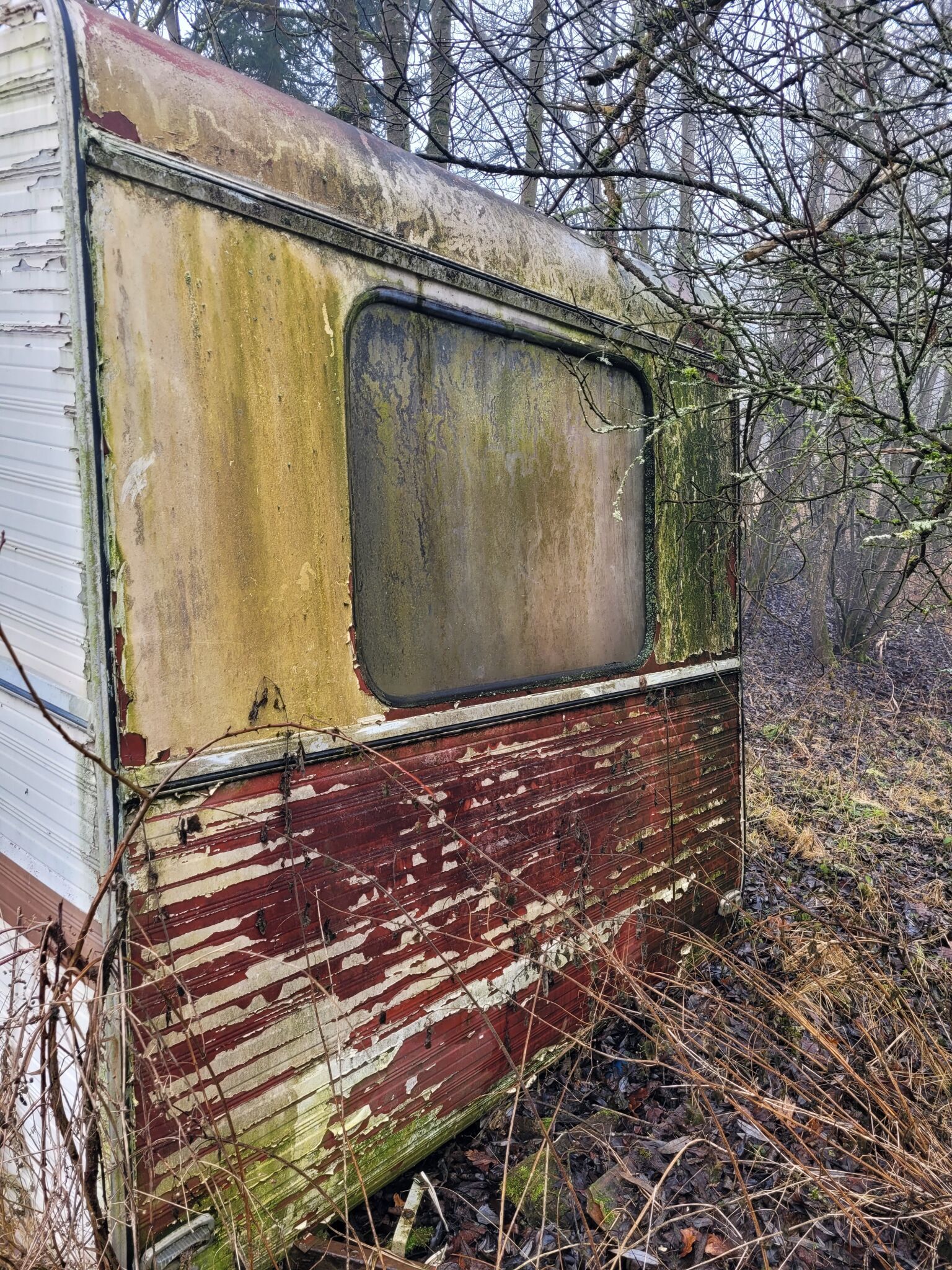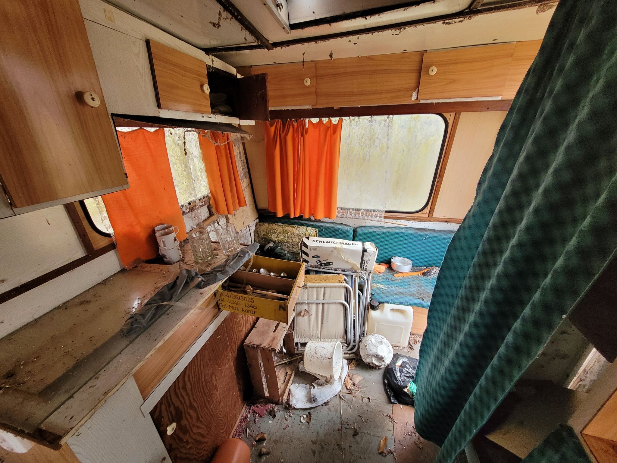 die schmuddelige Farbe blättert in dünnen Schuppen ab. Die Fenster sind dunkel, fast undurchsichtig. Die Äste der hohen Bäume wiegen sich langsam und gleichmäßig über der Karawane. Drinnen ist es kalt, obwohl es draußen noch nicht Nacht ist. Der Wohnwagen macht den Eindruck, als sei er nicht verlassen, sondern nur zu lange vergessen worden.