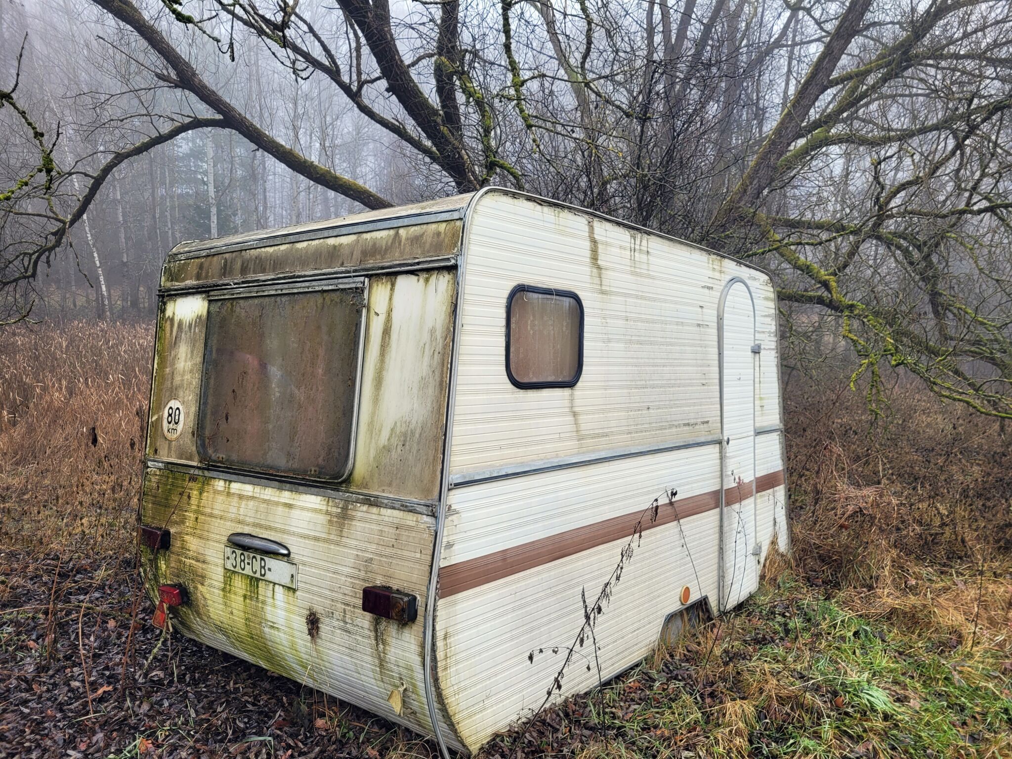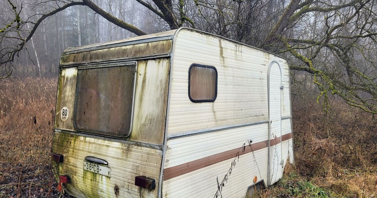zašlá barva se loupe v tenkých šupinách. Okna jsou tmavá, skoro neprůhledná. Větve vysokých stromů se nad karavanem houpou pomalu, vytrvale. Uvnitř je chlad, i když venku ještě není noc. Karavan působí dojmem, že tu není opuštěný — jen zapomenutý příliš dlouho.