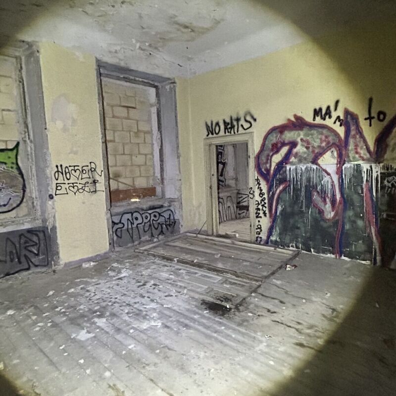 We go to the next location, but what we see makes us worry. A hole in the fence and a path of garbage, a textbook example of a homeless person. But we still go to the property and then to the villa. To our surprise, it's still intact.