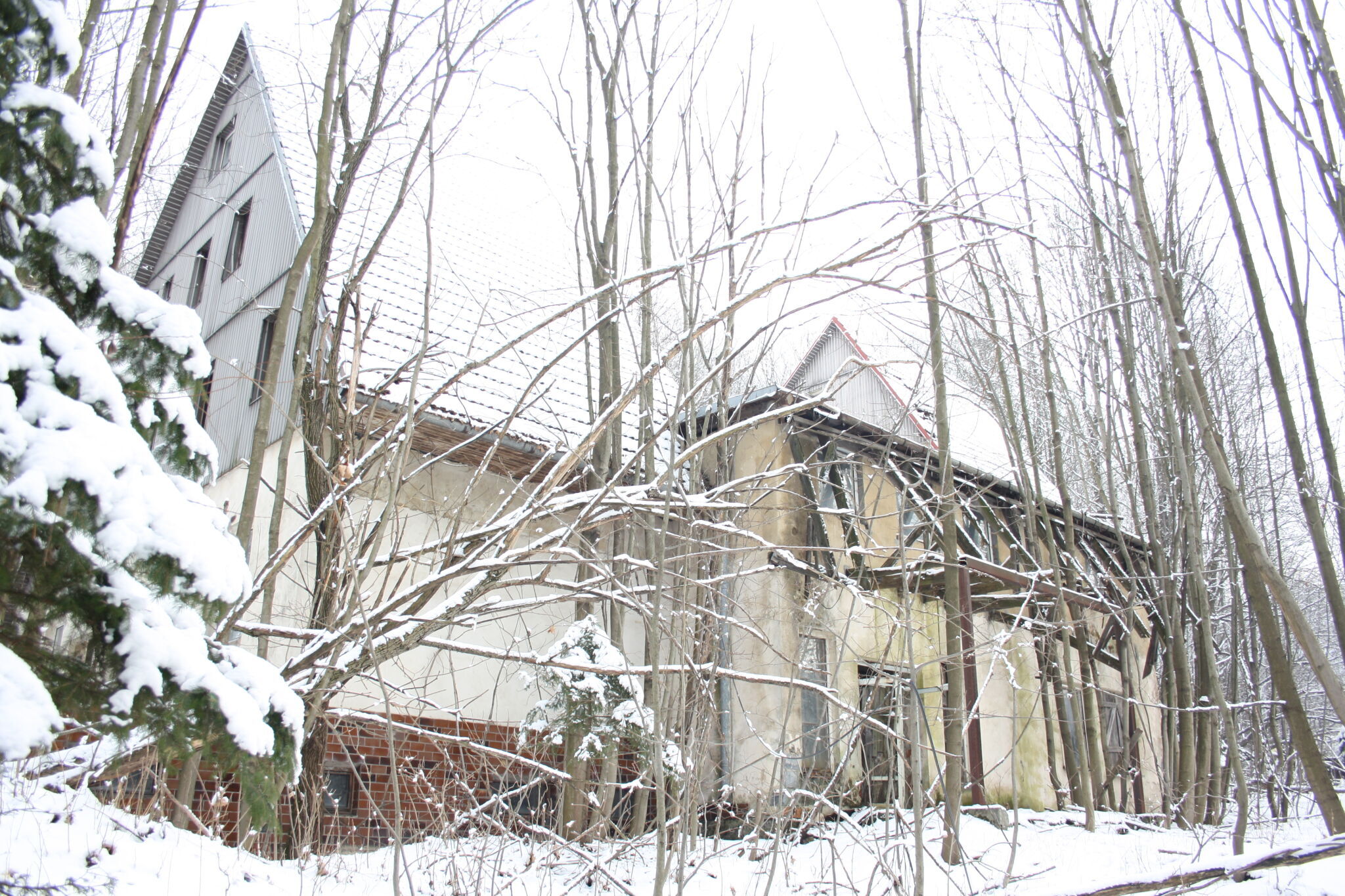 Hello, on February 1, 2026, I visited a truly strange and abandoned place. Interestingly, there is virtually no mention of this building on the internet. Even stranger is the fact that the building has no address number, so its origin and purpose remain unclear. This raises the question of whether it could have been a hotel, a recreational facility, or some other purpose-built building in the past. During my visit, I met a homeless man who probably lives there. He was calm and polite, only asking us not to disturb him, which we fully respected.